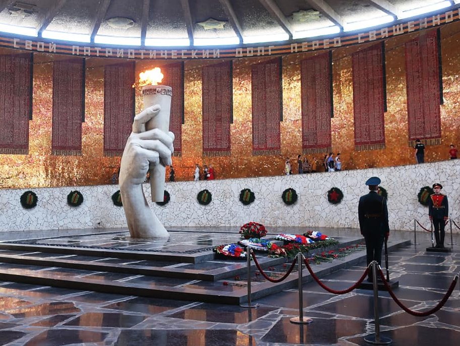 Родина-мать с огромным мечом. Вечный огонь, на стенах павильона словно на знаменах высечены имена героев Сталинградской битвы - рядовых, сержантов, санинструкторов... И свеча Вечного огня, и клочок синего неба в круглом отверстии свода.
