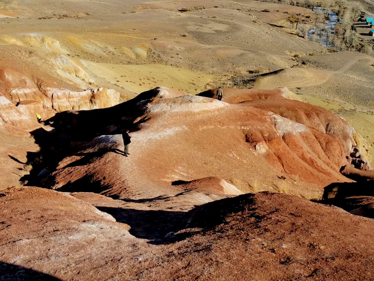 А вот следующий по курсу «Марс» - как бы оппонирует своей статичностью. Урочище Кызыл-Чин славится неземными пейзажами. Горные породы тут обнажаются своим безжизненным разноцветьем. Отсюда и народные названия - Марс-1 (красный каньон), Марс-2 (радужные горы серого, желтого, красного, фиолетового цветов), Луна (горы белоснежной глины). За рамками летнего сезона (когда поток «космонавтов» спадает) здесь можно вдоволь побродить отреченным от земных забот, если загрустишь по Земле - так кажущийся орбитальной станцией гремпинг быстро о ней напомнит.