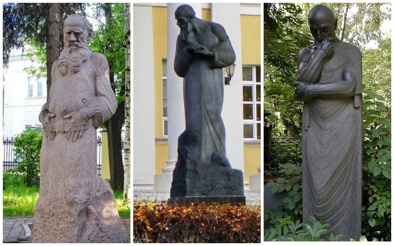 Скульптура Толстого в 1928 году был установлен в сквере Девичьего поля, недалеко от дома писателя в Хамовниках. Но в 1972 году памятник был заменен на более монументальный, а Меркуровского Толстого выселили, как и Достоевского, к музею писателя, на Пречистенку. Что касается третьей части триптиха, скульптуры “Мысль”, то она тоже несколько раз меняла дислокацию, пока не оказалась в 1955 году на могиле Сергея Меркурова на Новодевичьем кладбище.