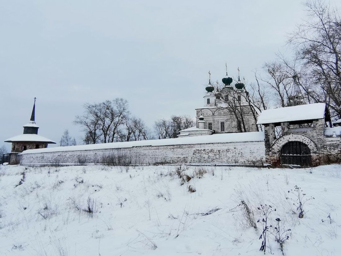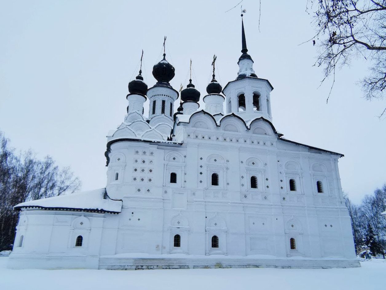 Два храма рядом посвящены устюжским святым. Церковь Иоанна Праведника (1656-1663) многократно перестраивалась и сегодня принадлежит, как говорится, сразу всем архитектурных стилях. Ну, почти. Тем и хороша.