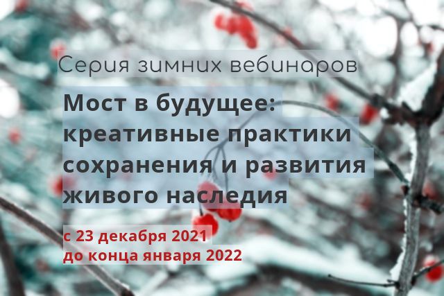 Продолжаем зимний онлайн-марафон вебинаров "Мост в будущее: креативные практики сохранения и развития живого наследия"! Ждем вас 16 февраля в 13-30. Регистрируйтесь по ссылке и подключайтесь к нашему вебинару (время в расписании московское)! Вебинары пройдут на платформе Zoom, ссылки на них будут высланы зарегистрированным участникам за час до начала каждого вебинара. Ссылки на видеозаписи вебинаров будут рассылаться зарегистрированным участникам.