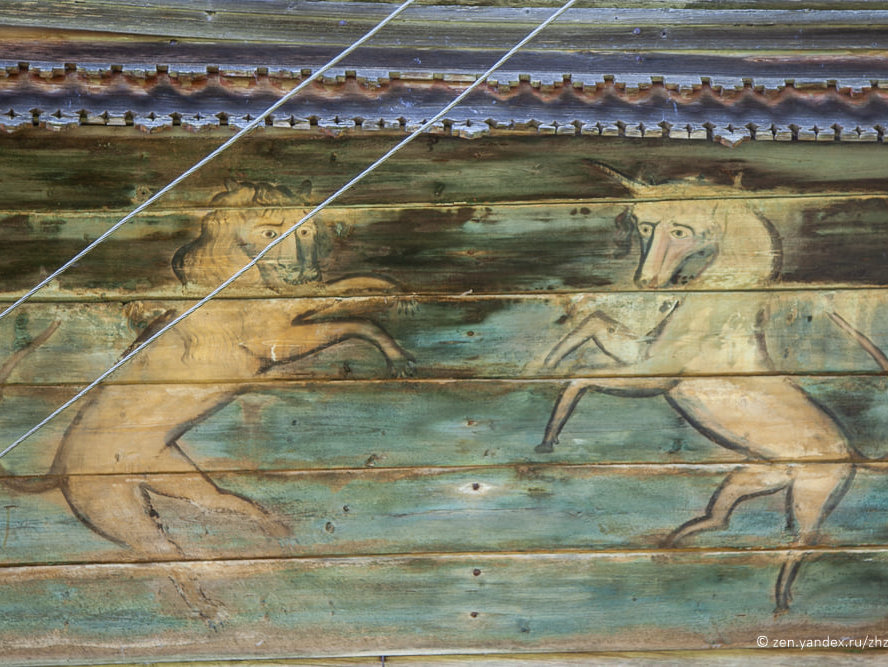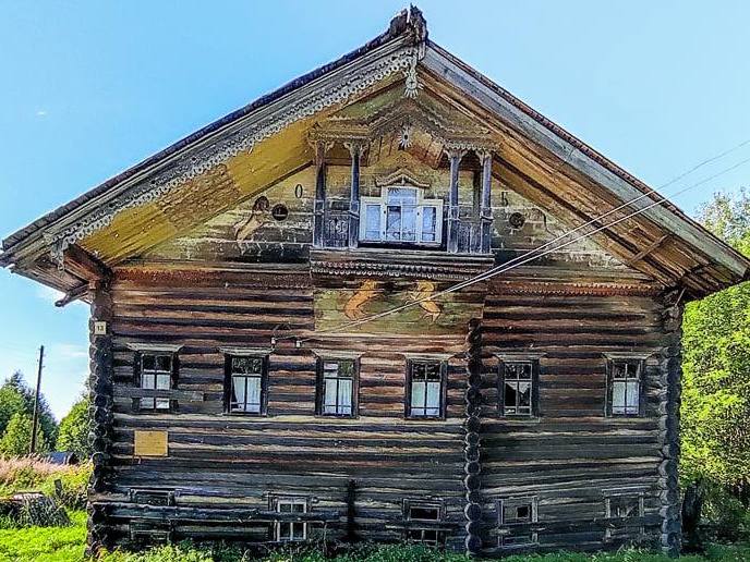 Столетие назад на десятках (сотнях?) домов в важском бассейне сверкали красочные львы и единороги. Сейчас осталось 5-6 домов, разбросанных по деревням в нескольких часах езды от Вельска. Едем в Тимоневку, здесь дом Бураковых-Жилиных с яркими росписями, но хозяйка уехала в город, здесь не живёт - фонд "Вереница", занимающийся деревянным наследием Севера, пытается его выкупить и сохранить. Если домом не заниматься - будет как в доме Суетиных в соседнем Долматове, где остатки льва и елинорога (или двух львов?) лишь угадываются на фасаде...